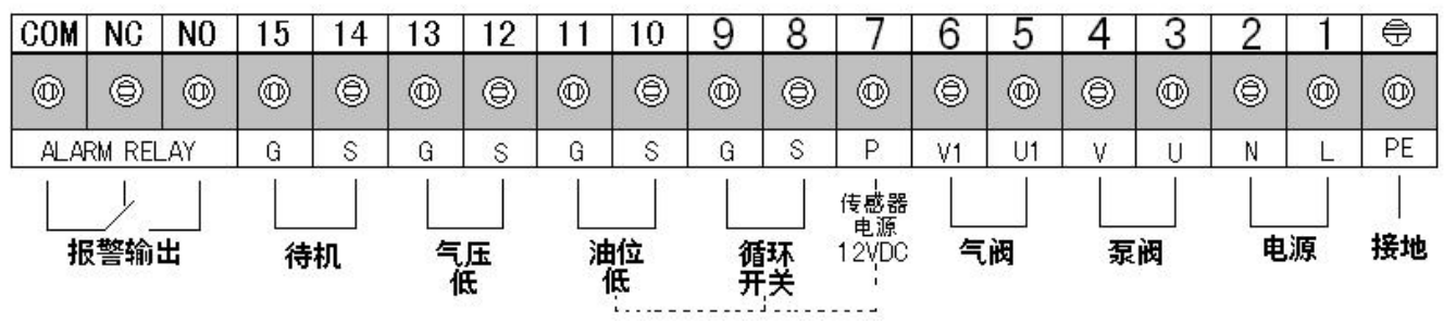 端子 12、13 接低氣壓信號檢測開(kāi)關(guān)(此開(kāi)關(guān)閉合控制器報警)。