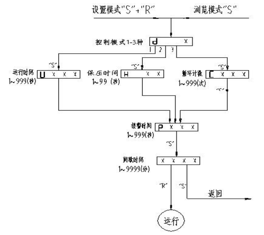 控制器處于任何狀態(tài)下按動(dòng)“S”鍵即可瀏覽已存貯的各項參數,不影響當時(shí)狀態(tài)。停止按鍵片刻即自動(dòng)返回。