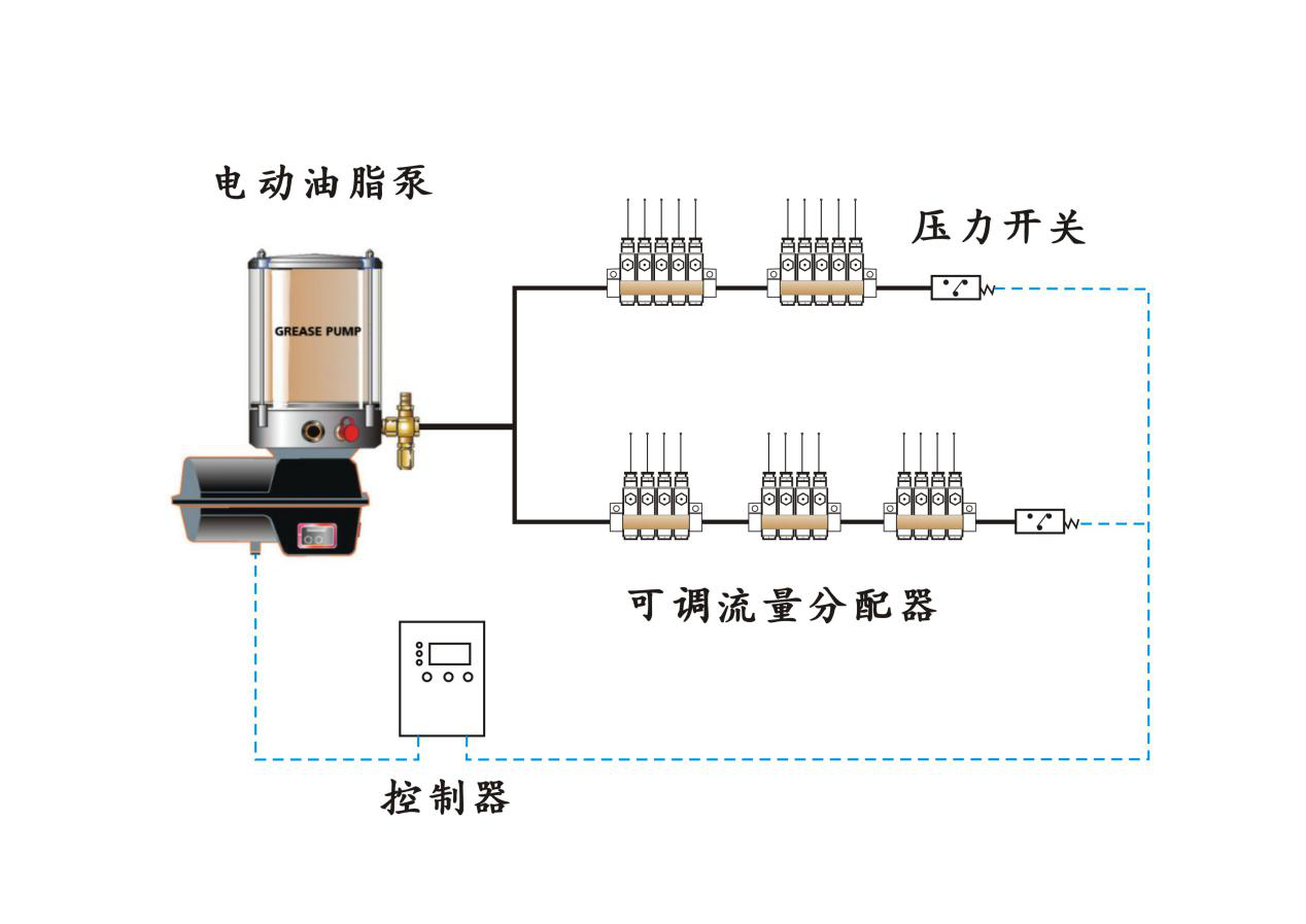 流量可調,可以在不必停機的情況下隨時(shí)調節流量以適應不同潤滑點(diǎn)的注油要求。